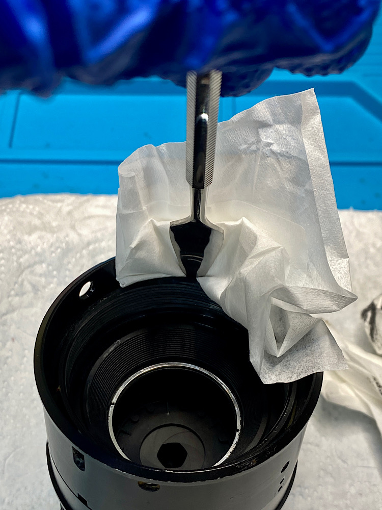 Die Helicoide für die Makrofunktion am hinteren Ende des Zooms demontiere ich nicht und spüle ebenso mit Sprit.