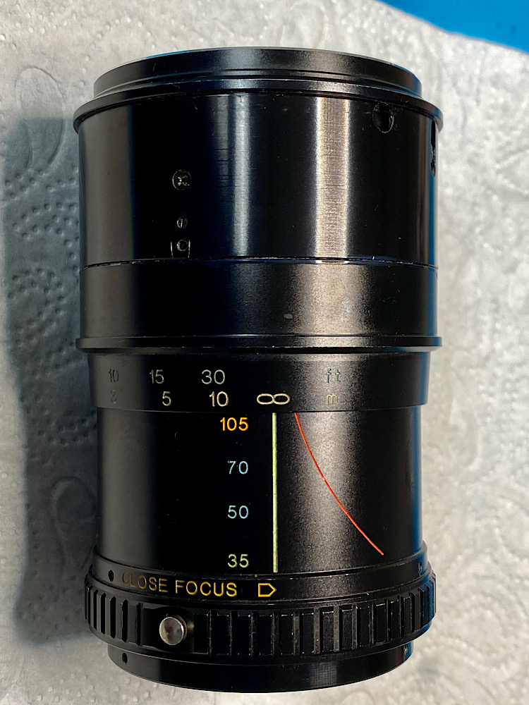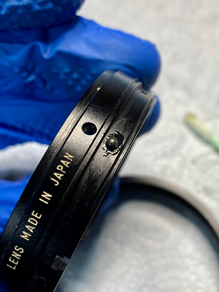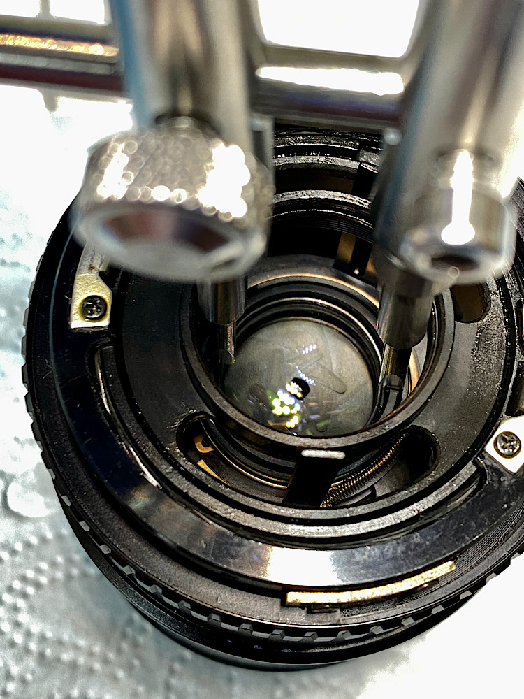Mit auf die Frontlinse aufgesetztem Lens Sucker drehe ich auf Unendlich ein und fixiere diese Position mit kleinen Stellschrauben am Fokusring.