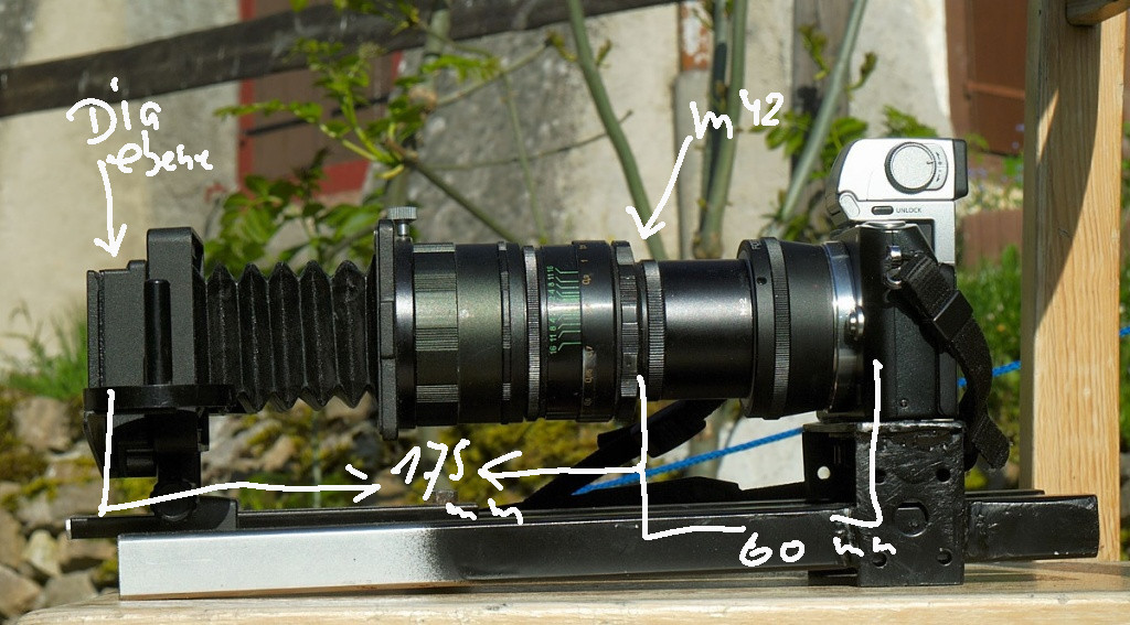 Und nun das NOVOFLEXAR (im montieren Zustand gezeigt im anderen Thread ) und nix geht garnix. Leider habe ich keine 100mm M42 Festbrennweite, um es mal damit zu testen. Aber die Tendenz aus den beiden gezeigten Bildern ist klar, und man kann sich leicht vorstellen, wie die Abstände für 105 mm Brennweite sein müssten. Wie aus dem Threadtitel hervorgeht, gibt es ja offenbar eine ein spezielles Diakopier-Balgengerät von Novoflex, und dort ist ein 60 mm-Objektiv drin. 60 mm machen ja auch Sinn, wie die obigen Bilder zeigen.