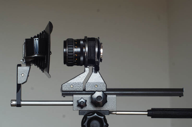 Wenn ich das NOVOFLEXAR 4/105 gegen ein beliebiges 50er austausche, sieht der Setup so aus und alles ist prima scharf und das Format passt ( erstes Bild ).