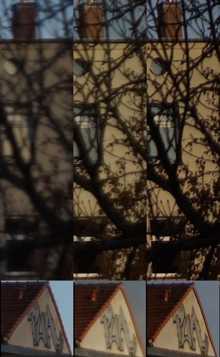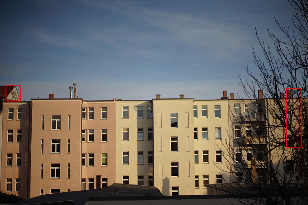 Das zweite Bild zeigt das Verhalten noch etwas deutlicher. Die gegenüberliegende Hauswand fällt nach links etwas nach hinten ab, was man auf dem Bild nicht erkennen kann. Fokusiert war einer der Schornsteine in der Mitte. die rechte Haushälfte liegt also leicht vor dem Fokuspunkt, der Baum steht in der Tiefe etwa mittig zwischen Kamera und Fokus.