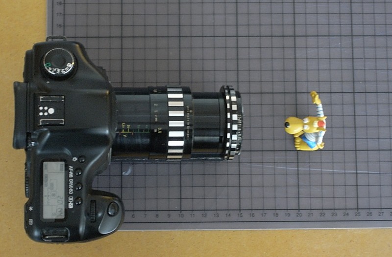 20 cm von der Filmebene, etwa 5cm vom Objektiv Vorderkante bei 1:1.