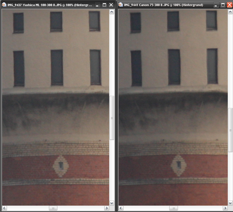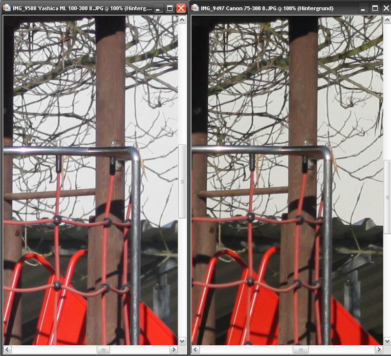 zwei 100% Crops bei 100mm, f8, Iso 400, Mitte und linker Bildrand, jeweils links Yashica, rechts Canon: