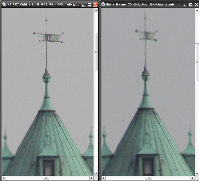 Motiv und 100% Ausschnitte bei f5,6 und f8, Iso 400. links Yashica, rechts Canon
