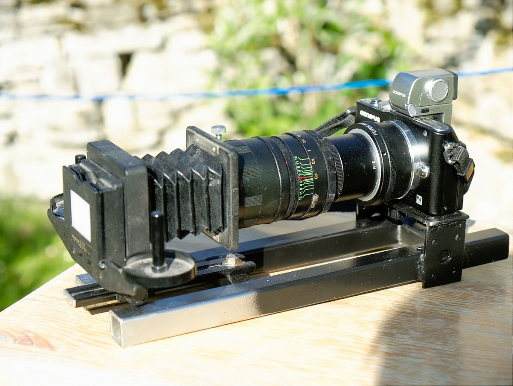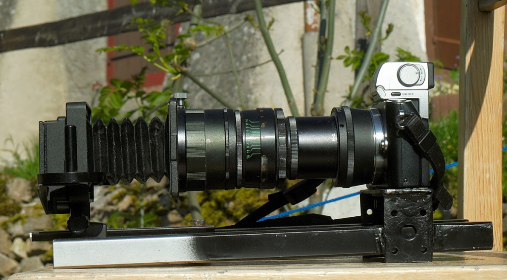 Ein M42 adapter wodrauf ich einen Zwischenring schraubte, (30mm) ein Helios 50mm, wieder einen Zwischenring (35 mm ) da der Balgen zu kurz war.