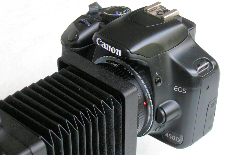 Es könnte funktionieren. Wenn die "Nase" der Kamera (Gehäuse des internen Blitzes) nicht wäre, auf jeden Fall. Derzeit habe ich den Yashica 27mm Zwischenring eingesetzt, um mit dem Balgen am Blitz vorbeizukommen. Der dürfte aber zu lang sein, um 1:1,6 zu erreichen. Mit ca. 17 mm ginge es sich aus, den Balgen an der EOS anzusetzen.