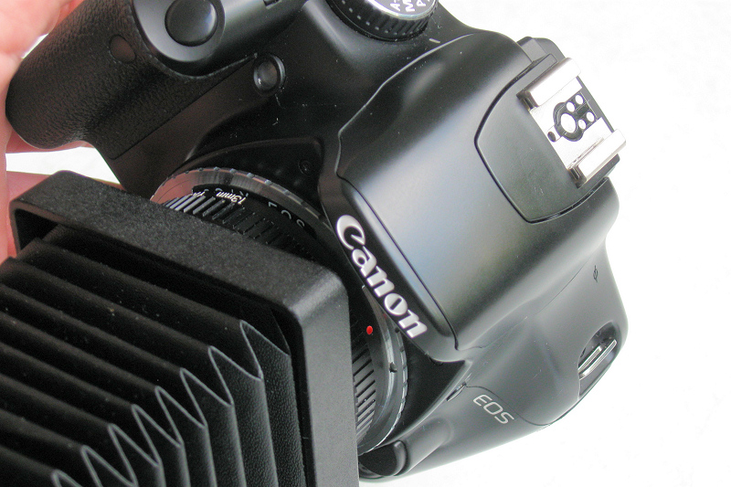 Problem #1: Die Standarten des Balges sind so groß, daß der eingebaute Blitz der EOS 7D im Weg ist, um das Bajonett zu schließen. Löffel berichtete, daß dies bei der EOS 450D ebenfalls der Fall ist.