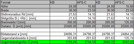Wenn wir dieser Logik folgen, würde bei Verwendung eines 200 mm KB-Objektives an einer KB-Cam und eines 135 mm-APS-C an einem APS-C Cam jeweils Formatfüllung mit einem 2600 mm Objekt erreicht, siehe Tabelle.