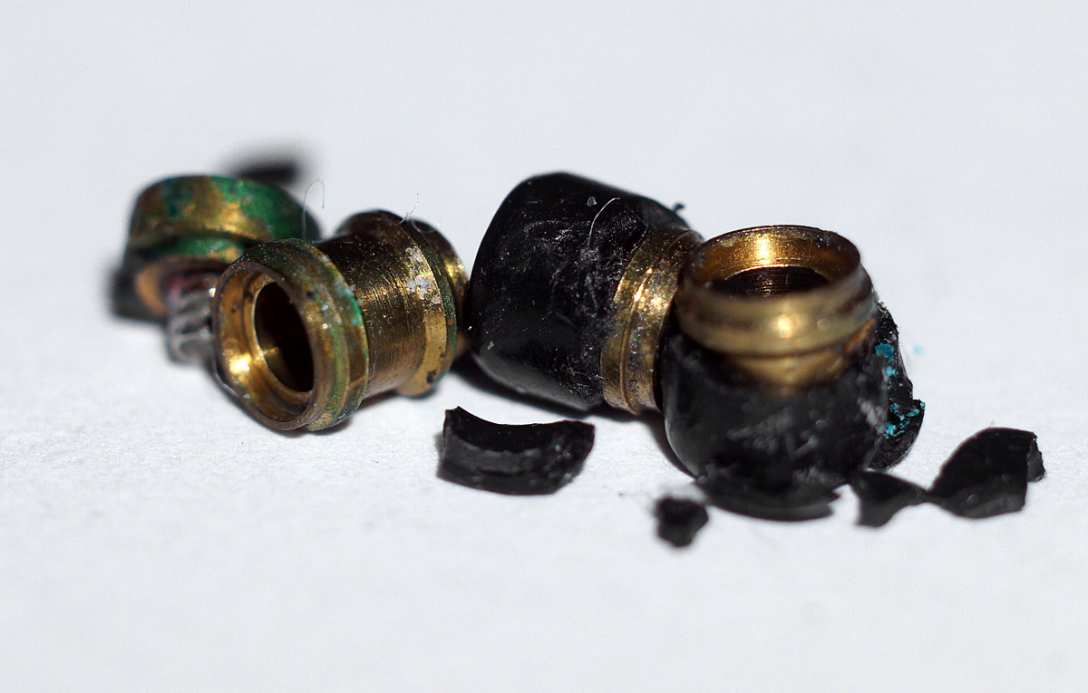 Daher kam das seitliche Spiel. Ausgemessen haben die intakten Rollen einen Durchmesser von genau 4mm !! Hier war die Messingrolle nur noch 3mm im Durchmesser. Daher kam das seitliche Spiel.