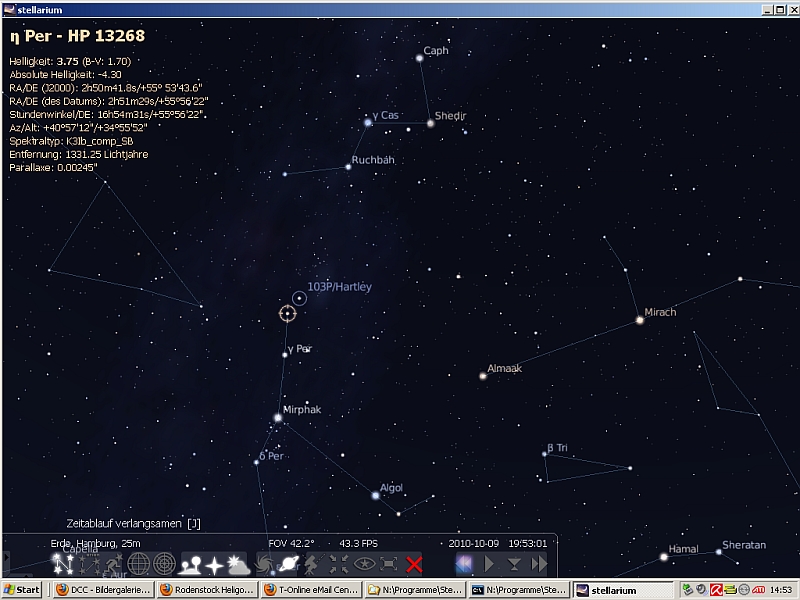 Neben Jupiter und Uranus werde ich mich heute mal an den Kometen 103P/Hartley machen. Er steht zur Zeit zwischen Cassiopeia und dem Perseus, nahe eta Per.