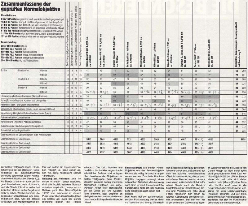 Ich hätte nur, falls es Dir vielleicht bei Deiner Entscheidungshilfe hilft, ein Objektivtest von 1980 vom legendären Walter E. Schön aus der Color Foto, wo neun 1,2er Linsen mit 50-58mm getestet wurden und das 1,0/50-Noctilux (welches letzter wurde).