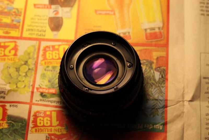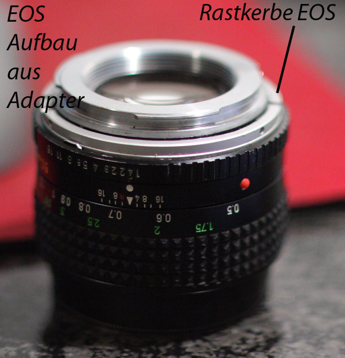 Hierbei handelt es sich um ein Minolta MC Rokkor 1.4/50mm PG, das auf diese Weise (wie viele andere Minoltas auch) mittels eines M39 auf EOS Adapterturmes und schleifen der alten Minolta - Auflage um 0,5mm nutzbar gemacht wurde und damit auch "Unendlich erreicht"..