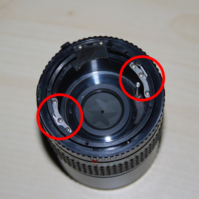 Es geht deutlich einfacher bei den Teilen, wo die Stellkurve der Blende mitsamt Deckel in dem sie sitzt, übernommen werden muss. Der Witz besteht doch nur darin, die 0,5mm Differenz des Auflagemasses von Rokkor Position zu EOS Position zu gewinnen. Das kann man durch Abbau des alten silbernen Aufbaus (von innen zumeist mit 4 Schrauben durch den Deckel geschraubt) und anschließendem Schleifen um 0,5mm erstmal sauber mit einem Dremel hinbekommen.