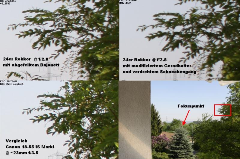 Oder du schraubst schnell das 18-55er IS auf deine Kamera (falls vorhanden) und vergleichst es bei vollen 10x Vergrößerung bei ~24mm Brennweite am Rand mit deinem konvertierten 24er .. wie erwähnt, nur hier zeigt mein Umbau noch echte Schwächen, mittig ist die Schärfe gut.