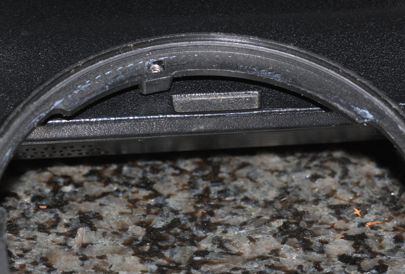 Der Blendenring-Übertragungshebel läuft, wie man sehen kann unterhalb der neu geschliffenen Auflagefläche für das Bajonett. Da wir diesen mit dem Blendenring rotierenden Blendenübertragungs-Hebel ja direkt am Blendenring befestigt haben, müssen wir, weil dieser Hebel am Blendenring etwas „aufträgt/in der Höhe übersteht“, quasi noch einen Tunnel feilen oder schleifen, der es dem eingebrachten Blendenübertragungs-Hebel gestattet, in der vollen Drehbewegung des Blendenringes unterhalb der Auflagefläche zu laufen. Also schleifen wir von unten eben noch eine Aussparung hinein, für die gesamte Strecke des Drehweges des Übertragungshebel von Offenblende nach geschlossener Blende.