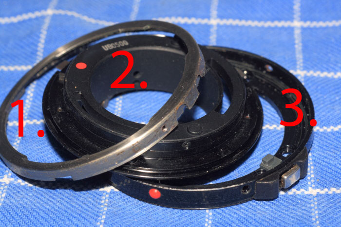 Du musst ihn "aushängen", was bedeutet, der lange Hebel mit der Steuerungsbahn für den internen Blendenmitnehmer in dem Bild, korrespondiert mit einer kleinen Blechplatte im Inneren des Objektivkörpers und hat eine kleine Nase, die in der Steuerungsbahn läuft. In einem der Bilder sieht man es auch. Ist damit klar, dass diese "Nase" zunächst verhindert, dass Du die gesamte mit Nr. 2 bezeichnete Platte herausziehen kannst.