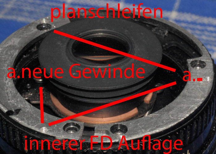 Diese wird zunächst ziemlich aufwändig von den seitlichen Erhebungen getrennt und anschließend heruntergeschliffen, so das sich eine ebene Auflageplatte ergibt, die mit dem Objektiv wieder verschraubt wird. Auf diese Auflagefläche wird später der neuen EF Adapter plan aufgebracht. Aus diesem Grund müssen an geeigneter Stelle auch neue Gewinde gebohrt und geschnitten werden.. diese können mit per Klebstoff fixiertem Adapter frei ausgerichtet und gesetzt werden. Vorbohren mit 1.2mm, dann mit einer Gewindeschneide auf 1.6mm Gewinde einbringen.
