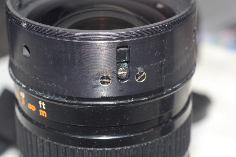 Dieser Schlitz muss genau gearbeitet werden, damit beim Zoomvorgang es nicht zu einer Veränderung der Blendenlamellen kommt. Als Vorlage für die Schlitzbreite wurde das Originalteil genommen und ausgemessen. Der Schlitz wurde mit dem Dremel mit zwei Schnitten gemacht und mit einer Feile passend nachbearbeitet. Ich habe allerdins nicht die Schrägung des Originals nachgebildet, sondern bin starr mit geraden Schnitten vorgegangen. Dadurch hat die Blende nun einen konstanten Schließwinkel, statt sich brennweitenabhängig mit zu verändern.. ließ sich leider mit meinen Mitteln nicht anders machen.. und wäre ein sehr großer Aufwand geworden, den exakten Winkel zu bekommen. Wenn dann nur ein Schnitt daneben geht oder die Richtung nicht stimmt, wäre der Effekt ebenso eingetreten.. Im Zeitalter der DSLR Kameras ist das eh egal, weil ohnehin keine mechanische Übertragung des Blendenwertes an die Kamera erfolgt, sondern nach "kamerainterner Waage" vorgenommen wird. Somit ist die Schrägschlitzung erstmal egal aus meiner Sicht.