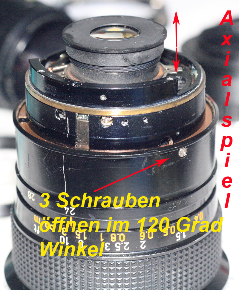 Und mir ist zudem beim Abnehmen des Frontrings, der bei mir mit 3 Madenschrauben befestigt war, ein sehr kleines Alu-Drehteil entgegen gekommen, das als Verdrehsicherung für den Frontring benötigt wird. Der ursprüngliche Platz dieses Teils ist in dem Bild von mir etwas unscharf links zu sehen (das mittlere der drei Löcher wenn man von der Unendlich-Markierung Richtung Frontlinse geht).