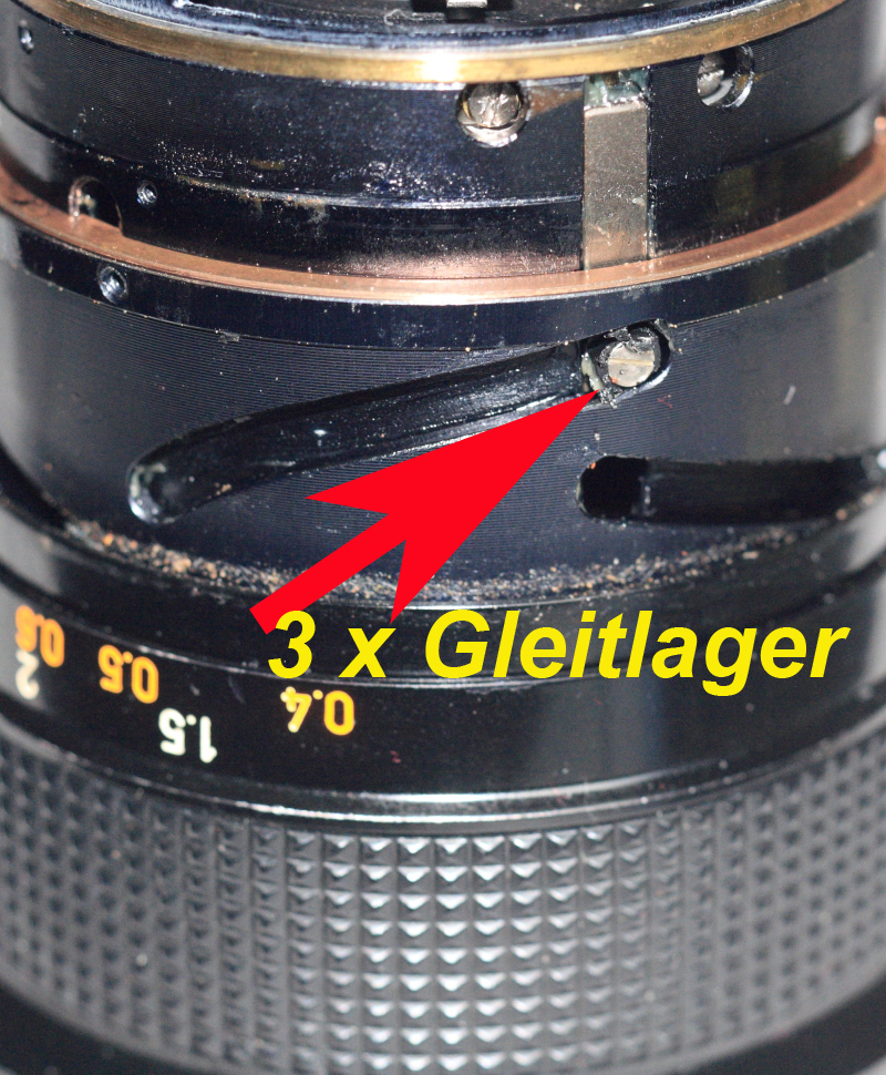EDIT 2: Ich hab mal noch ein Bild von den Gleitlagern gemacht. Mir ist beim Betrachter deiner Bilder aufgefallen, dass bei deinem Objektiv anscheinend Schmiermittel in der Führung der Gleitlager war. Das ist bei meinem nicht der Fall. Evtl. sind das trockenlaufende Lager.