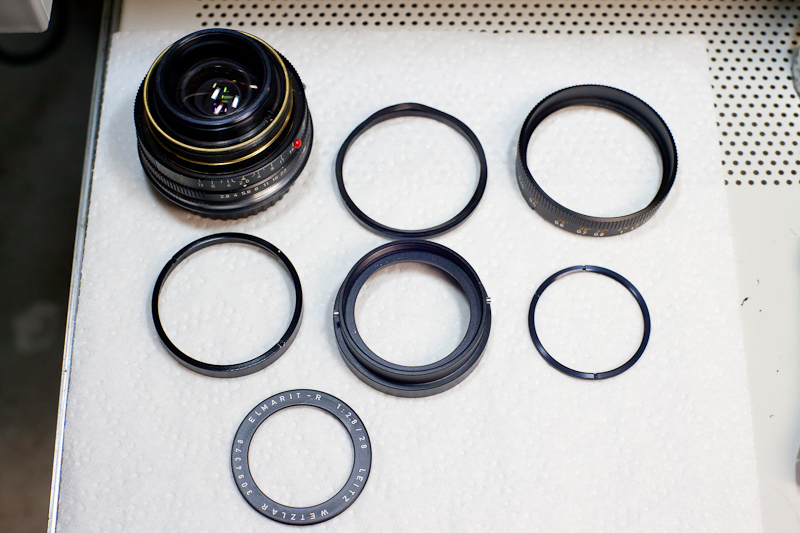 Hallo hinnerker, ich denke, mit dem eingeklipsten Ring hast Du recht. Ich habe jetzt einfach mal mein Summilux-R 50 1.4 (ja, ich bin in den letzten Tagen an meine ersten Leica-Objektive gekommen, manchmal hat man einfach Glück), welches genau den gleichen Tubusaufbau vorne hat, also mit den Nasen für die Sonnenblende, und siehe da, der Ring ließ sich locker abschrauben. Darunter dann kam ein Spannring zutage. Nachdem ich den abgeschraubt habe, hatte ich den Tubus in der Hand. Ganz einfach, das Ganze. Unter dem Tubus sehe ich nun allerdings keine Schrauben, sondern einen weiteren, natürlich wesentlich größeren Spannring. Ich denke, dass dieser den Fokusring fixiert. Weiter habe ich nicht gemacht, wollte erst mal Deine Meinung dazu hören. Ich denke schon, dass dies beim 28er ähnlich sein wird.