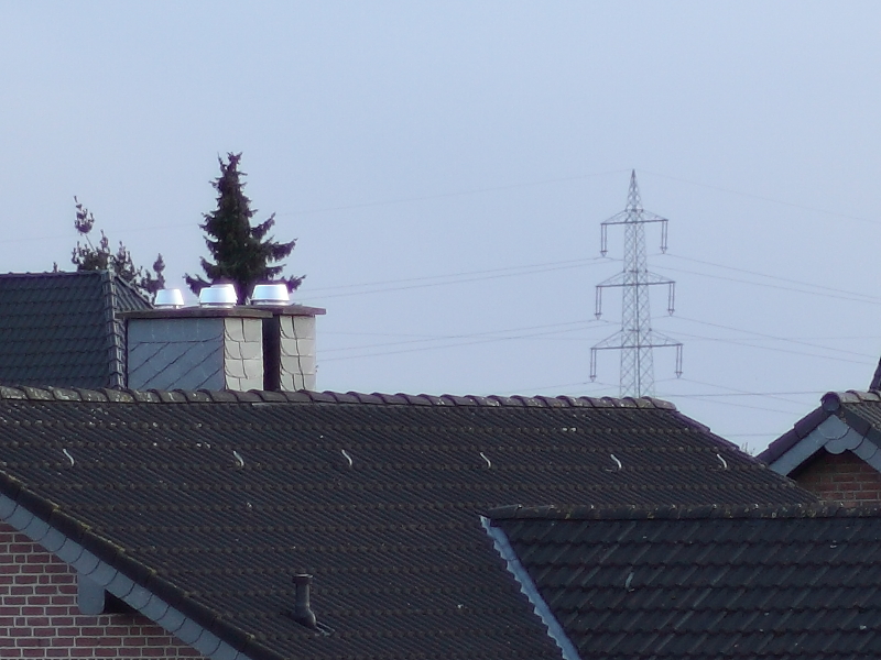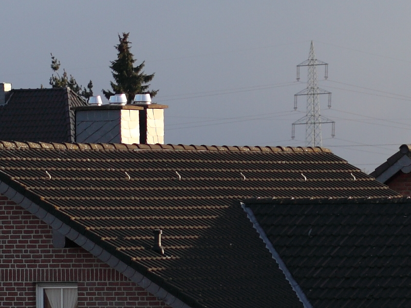 100% Crops, ca. 70 Meter entferntes Hausdach, der Strommast ist ca. 400 Meter entfernt. Ich habe auf den Strommast scharfgestellt. Es reichten minimalste Abweichungen, um entweder den Strommast oder das Hausdach scharf zu bekommen. Das Ergebnis ist ein Kompromiss. Jetzt verstehe ich langsam, wieso Testbilder wirklich mit Vorsicht zu genießen sind.