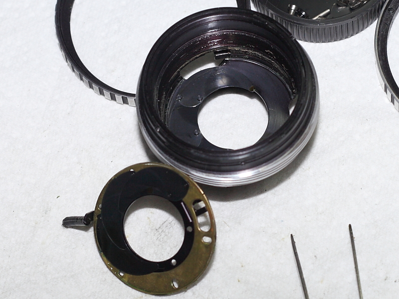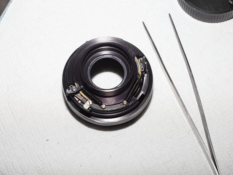 Dieses Objektiv nun wartetete mit der Besonderheit auf, innen "verharzt" zu sein. Der Begriff kommt ja immer mal wieder vor, wenn es um Fehlerbeschreibungen geht, doch ist dies nun meine erste Optik, die mir vor Augen führte, was das tatsächlich heißen kann. Als ich das Objektiv öffnete, war zu sehen, dass komplett alles, was hinter dem Bajonttdeckel zutage kam, mit einer Schicht verkleistert war, die teilweise so fest war, dass erst stundenlange Tauchgänge in Waschbezin die Teile voneinander lösen konnte. Dies betraf nicht nur die Blendenlamellen, sondern fast alle Teile. Seltsam war nur, dass die Optik frei davon war. Es blieb mir also nichts anders, als das Objektiv komplett zu demontieren. Ich dachte mir, dass ich den Zusammenbau ja hier dokumentieren könnte.
