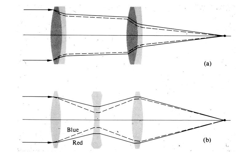Ein apochromatisches Objektiv, das dies ausgleichen sollte, besitzt eine größere Zahl (4-6) von Einzellinsen aus verschiedenen Glassorten. Sie haben gleiche Schnittweiten für die Wellenlängen (480 Nanometer = Cyan, 546 Nanometer = Gelb-Grün, 644 Nanometer = Rot).