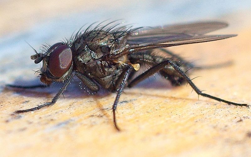 Bild mit 55mm Gesamtauszug.. und 100% Crop aus der NEX 5 (der alten 14Mp-Version), @f8 ... wollte mal sehen, wie gut es sich im absoluten Endbereich bei dem Auszug zusammen mit dem Crop schlägt.. also ob Abildungsfehler, CAs oder sonstige Probleme zu sehen sind.. Diese Fliegen, nur 4mm groß, ließen sich hin und wieder auf unserem Tisch nieder in der Sonne.. willkommene Gäste um mal auszuprobieren, was mit der Kombo geht..
