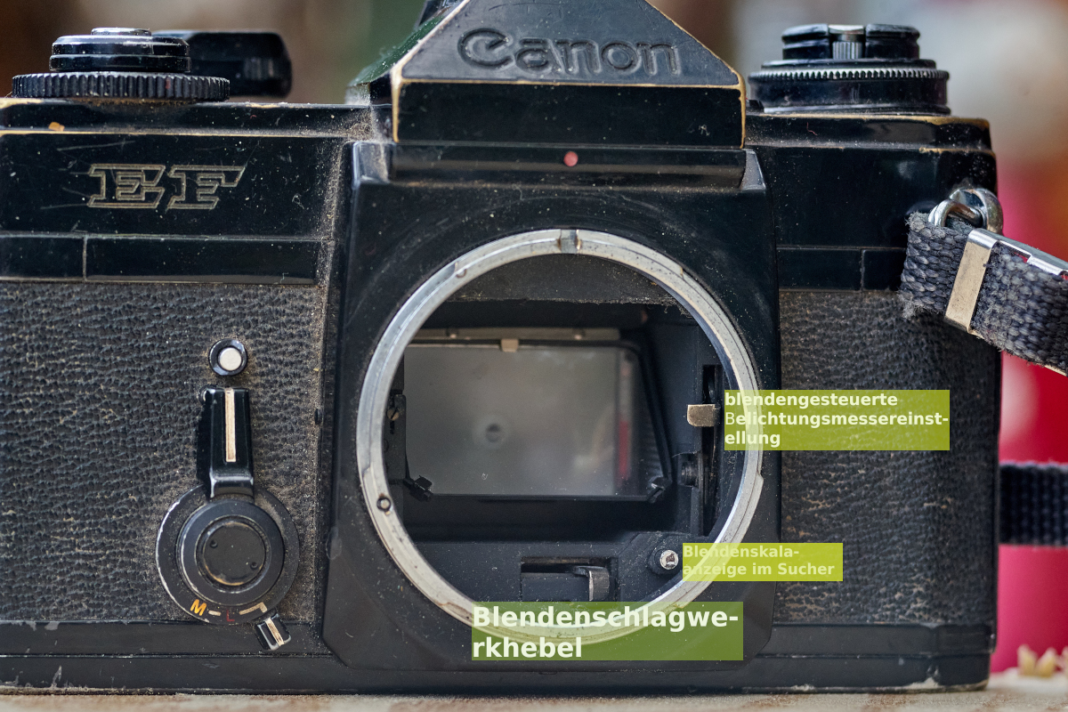 ....hier eine kleine Visualisierung mit meiner alten, zerbeulten und verstaubten Canon EF. Die hier gerade noch liegt, weil ich damit letzte Woche erfolgreich einen Film belichtet habe - allerdings nur manuell wegen Wackelkontakt.