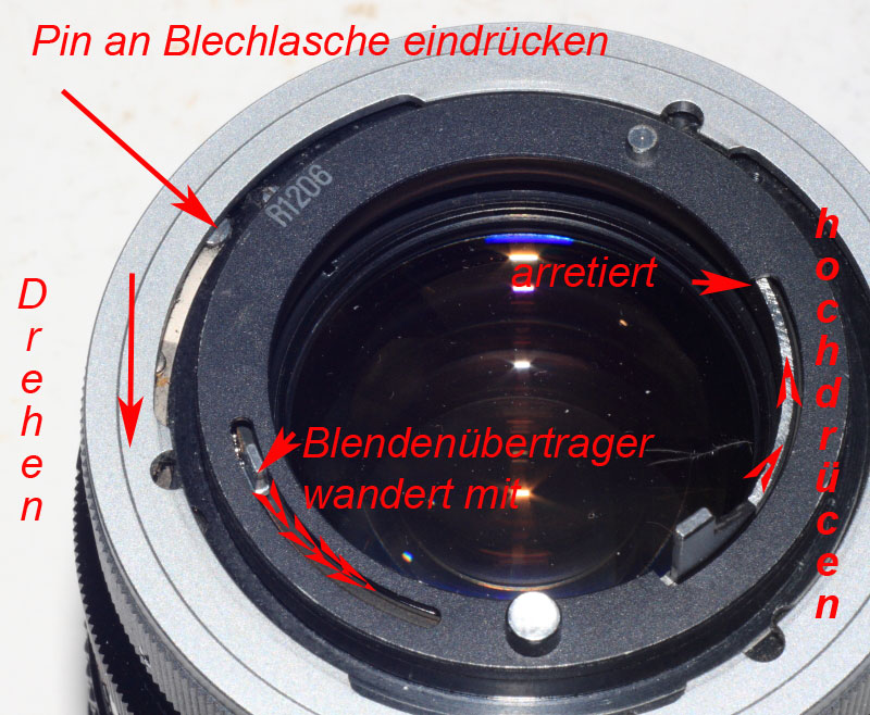 Also den PIN mit einem spitzen Gegenstand runterdrücken und den Chromring drehen, dann sollte alles klarer werden und die drei Pfeile zeigen, wie sich der Blendenübertragungshebel jetzt mit der Blenden einstellung mitdreht.
