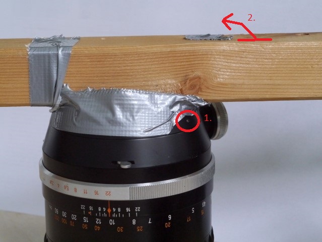den Blendenhebel losschrauben, die Stativschelle an ihrem Hebel auf "freidrehen" stellen und nach oben abziehen