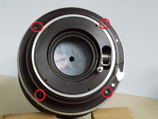 die drei Schrauben entfernen und den Teil nach oben abziehen. Blendenring ebenfalls nach oben abziehen