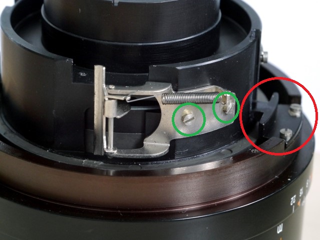 Von der Innenseite des äusseren Tubus kann man nun auch den Fokusanschlag lösen um das andersseitige Feingewinde auszuschrauben. Auch hier bitte auf die Anzahl der Drehungen achten (bei mir 9 1/2 Umdrehungen von der Unendlich-Stellung - in der Gegenrichtung übrigens 1 3/4 bis zum endgültigen Gewindeanschlag bei ca. 3 m).