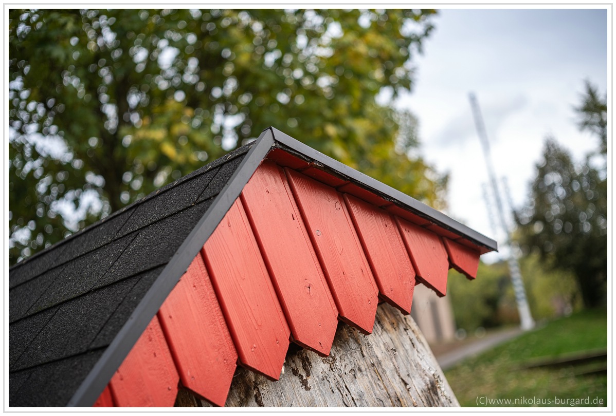 #17 + 18 Bildpaar vom gleichen Standpunkt - einmal fokussiert auf eine der roten Bretter/Schindeln, beim anderen BIld auf den Zunftbaum