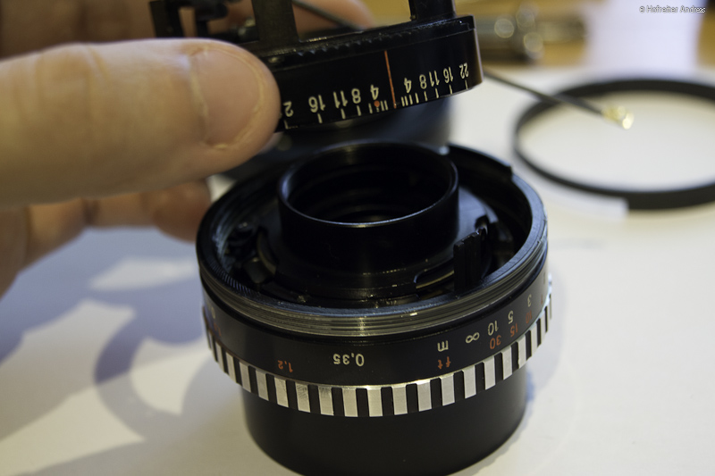 Abnehmen der Ringe, ausfädeln der Federn (bei mir incl. Federkürzung einer ausgeleierten Feder -> wieder mehr Zugkraft), Aufschrauben/Abschrauben der "Fokusringanschläge" (hier im Bild)