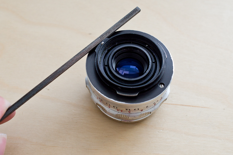 In der Regel sitzt das Objektiv nicht richtig im Gewinde des M42-Adapters, denn die drei Nocken des Bajonetts sind im Durchmesser etwas zu groß (siehe Bild). Mann könnte nun versuchen das Objektiv mit Gewalt in das M42 Gewinde einzudrehen, dann wäre aber der Adapter hinüber. Daher folgt nun der Griff zur Schlüsselfeile oder dem Schleifpapier. Damit werden die drei Nocken des Bajonetts minimal zugefeilt. ACHTUNG: Hier geht es nur um 10tel Millimeter. Somit bleibt auch gewährleistet, dass das Objektiv noch problemlos an einer Altix verwendet werden kann. Also lieber schrittweise vorgehen und immer wieder testen. Ihr hab dann genügend abgefeilt, wenn sich das Objektiv mit leichtem Widerstand ins M42 Gewinde fügt. Nach einer halben Drehung nach rechts, sollte das Objektiv nun relativ fest im Gewinde sitzen.
