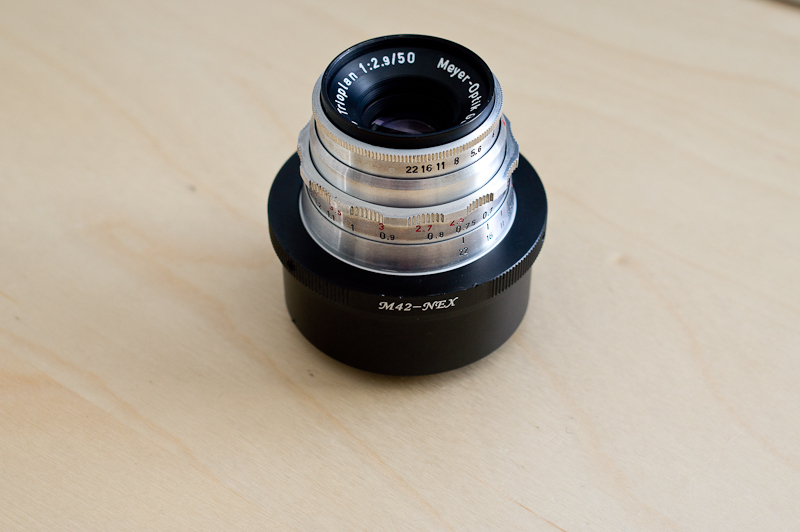 Da das kleine Ding in gutem Zustand war und M42 to Nex Adapter in der Bucht ja für ein Appel und ein Ei zu haben sind, habe ich mich ans Werk gemacht und siehe es geht.