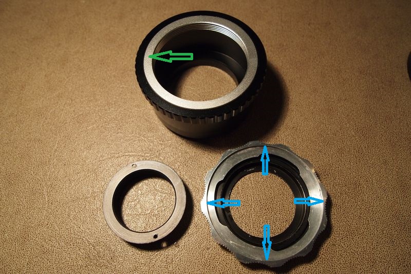 in meinem Beispiel in einen M42- m4/3 Adapter einbringen wollen. Hierzu entnehmen wir den Aluring (grüner Pfeil)