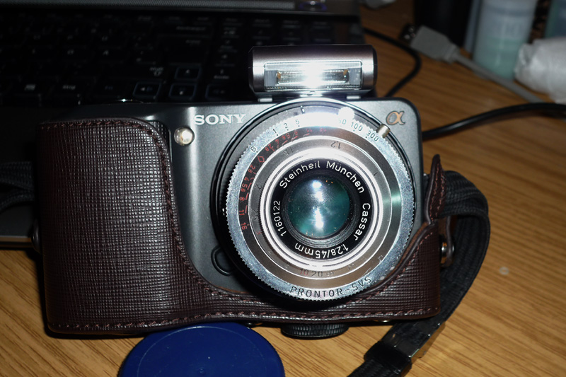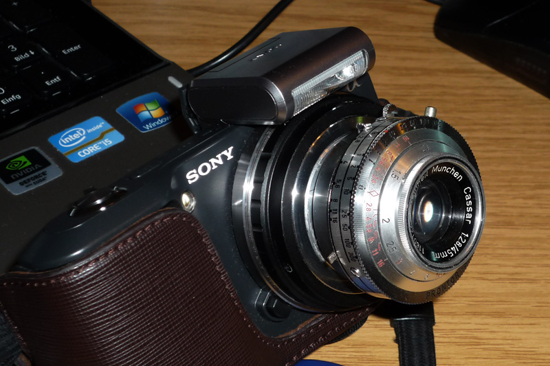 Dieses Steinheil Cassar 2.8/45 habe ich direkt an einen M39-NEX-Adapter angepasst. Fokussiert wird über den eigentlichen Fokusgang des Objektivs. Der ist nämlich noch intakt.