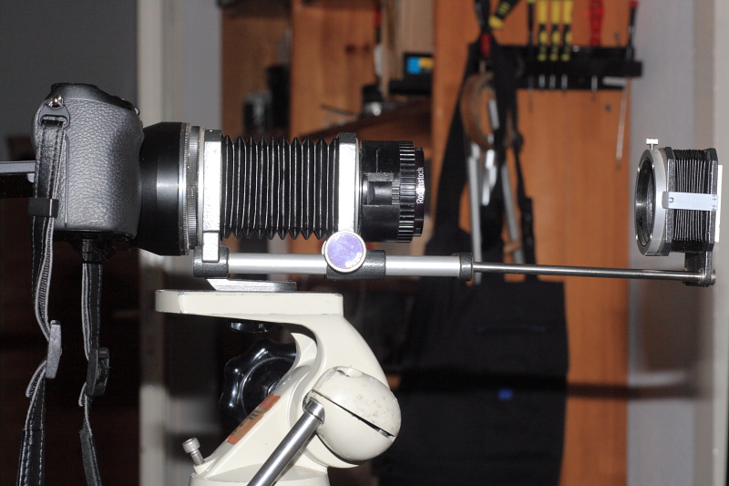Der Auszug von rund 35 cm an einem VNEX System mit einem shweren 75 oder 80mm Objektiv würde für diesen 1:1 Abbildungsmaßstab für das VNEX viel zu lang werden (Rodagon 4/80mm testweise drangebaut)..