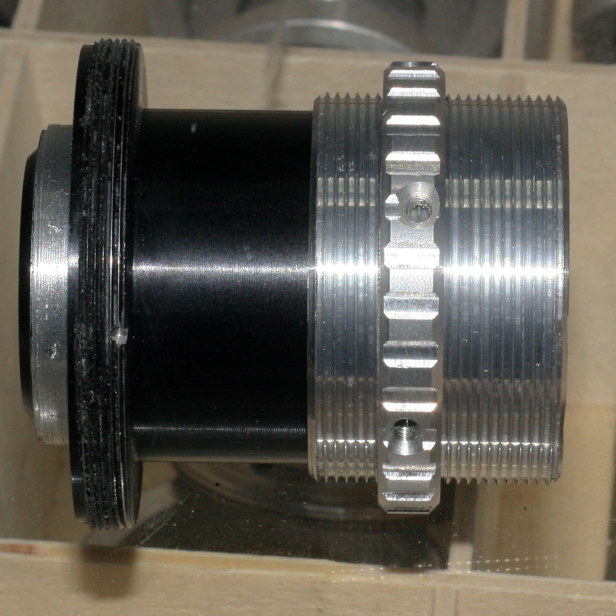 Das ursprüngliche Gewinde des Tubus wurde abgedreht (Danke Henry!) und an dessen Stelle ein VNEX-Innenverbinder als neues M39-Gewinde fixiert. Der Gewindering ist so positioniert, dass am VNEX-KB Tubus ohne Muttern gerade Unendlich erreicht wird.