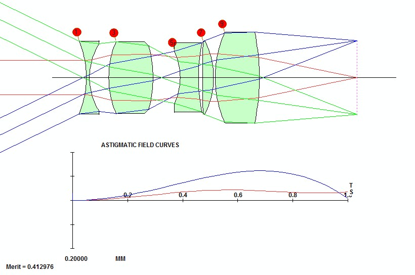 ich hab die letzten Tage versucht mich in Synopsys einzuarbeiten (Demo). Maximal 5 Linsen ist schon ganz gut für den Anfang. Der Findungsalgorythmus bietet eine gewisse Anzahl an den besten Möglichkeiten am Ende der Berechnung, die sehr kurios sind. Wenn ich z.B. "einfach" einen Tessar Typ (http://de.wikipedia.org/wiki/Tessar) haben will und mit 4 Linsen beginne, dann bekomme ich alles, außer der genannten Aufstellung.