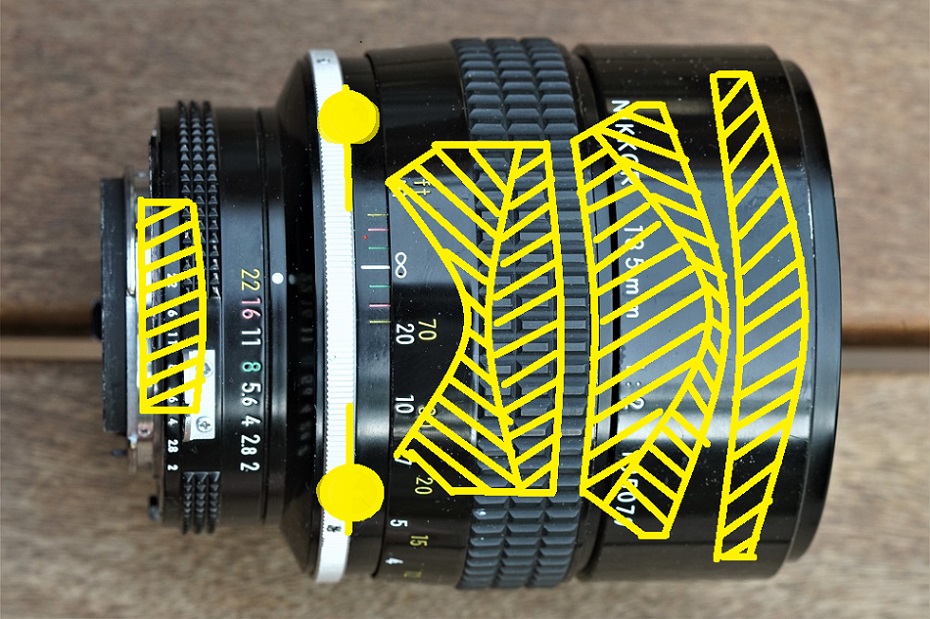 Mit dem 85 1.4 teilt es sich gleiche Filtergewinde (die Frontlinsen sind fast gleich gross) und das charakteristische Aussehen lichtstarker manueller Nikkore: der Blendenring ist relativ klein - er muss aufgrund der Blendenuebertragung mit den "Hasenohren" bei allen Objektiven den gleichen Durchmesser haben. Vor dem Blendenring steigt der Objektivdurchmesser dann sprunghaft an.