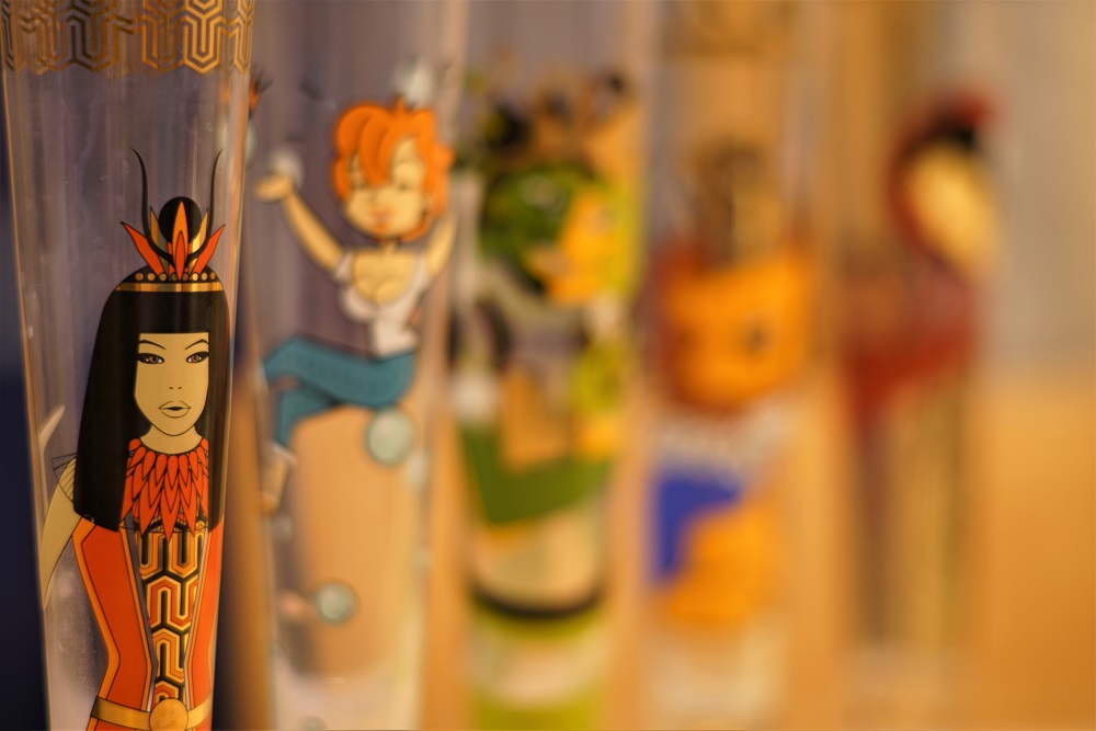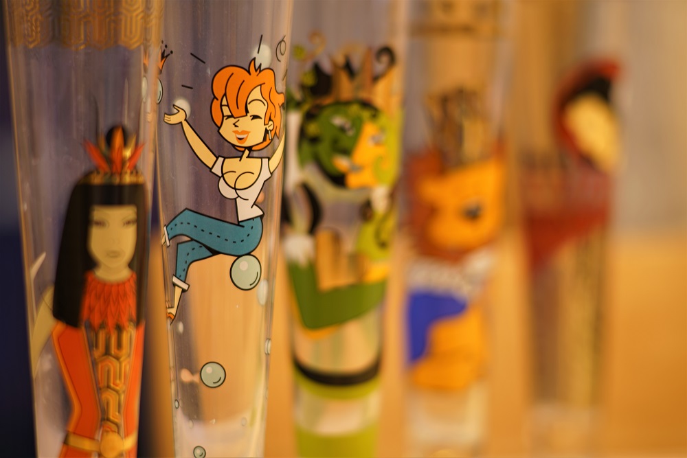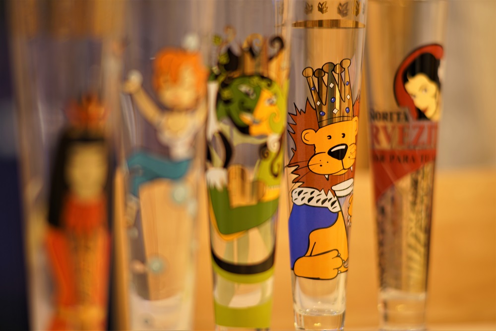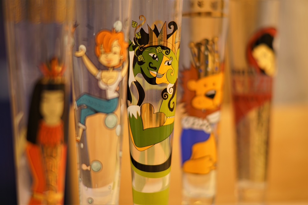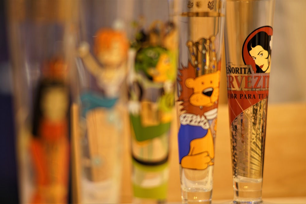 Eine Fokusreihe mit schön bedruckten Pilsgläsern, von Nah bis nicht ganz so nah, alle bei f/2: