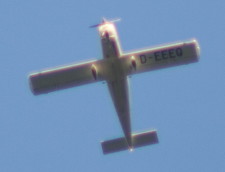 Gegenlicht, direkt in die Sonne. In den ueberbelichteten Bereichen sind die Farbfehler auch sehr stark, was aber wohl eher daran liegt, dass ein Bayer-Kanal vor dem anderen in Saettigung geht. Einen Crop spare ich mir: