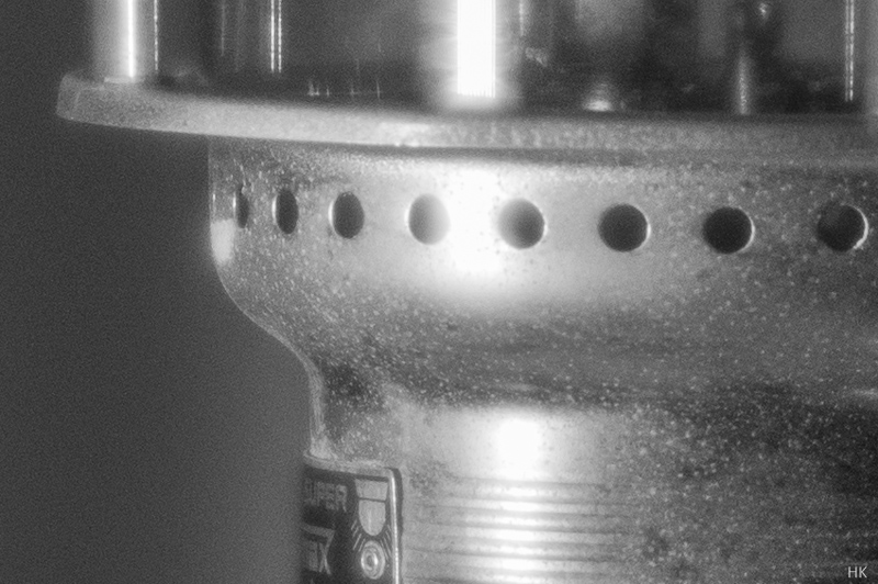 Natürlich zerfließen metallische Glanzlichter bei Offenblende recht deutlich, aber dennoch kann man auch bei dieser Blende Bilder machen, die in normalen Bildschirmauflösungen gut brauchbar sind. Bei f/2 (was ja für ein 100mm-Objektiv immer noch sehr lichtstark ist) wird es noch deutlich besser und man kann auch feine Strukturen gut aufgelöst erkennen. Bei f/2.8 wird schon nahezu das Optimum bezüglich Schärfe und Kontrasten erreicht, ab f/5.6 geht es dann wieder tendenziell abwärts und komplett abgeblendet wird es wieder ziemlich unscharf - vermutlich wegen Beugungseffekten.