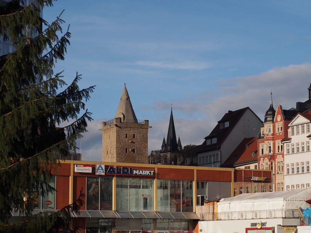 Mit etwas Mühe und Geduld bekommt man auch ein schönes Kringelbokeh, vor allem wenn auf den Nahbereich fokussiert wurde. Erstaunt hat mich die Zentrumsschärfe auch sehr weit entfernter Objekte, anbei ein Bild der Leuchtenburg bei Kahla, fotografiert von einer Jenaer Anhöhe, Luftlinie bestimmt 15 Kilometer.