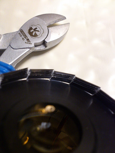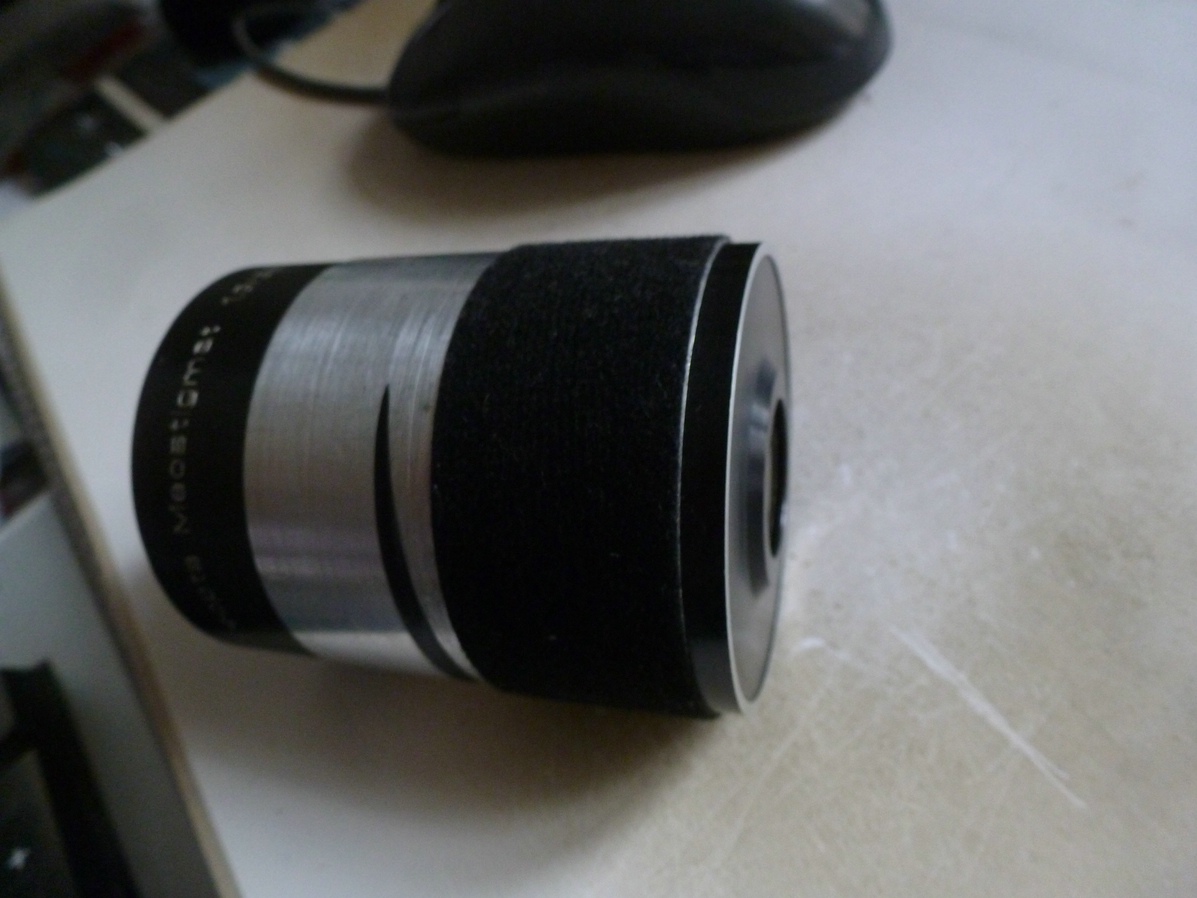 Das Objektiv selbst gehört zu einem tschechischen 16 mm-Filmprojektor der Marke Meopta. Es hat im Ursprungszustand eine Länge von ca. 70 mm und einen Durchmesser von 52,5 mm. Wenn man das eigentliche optische System heraus operiert, bleibt ein Zylinder von ca. 35 mm Durchmesser und 37 mm Länge übrig, der sich mit etwas Aufwand an das VNEX-System adaptieren lässt. So sieht das ganze dann im benutzbaren Zustand aus:
