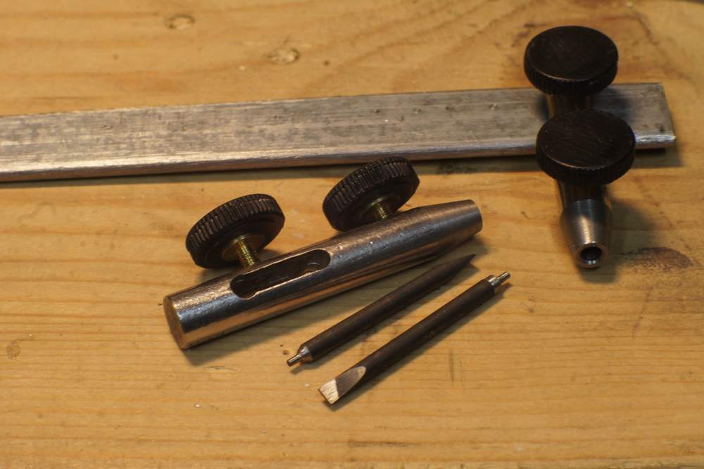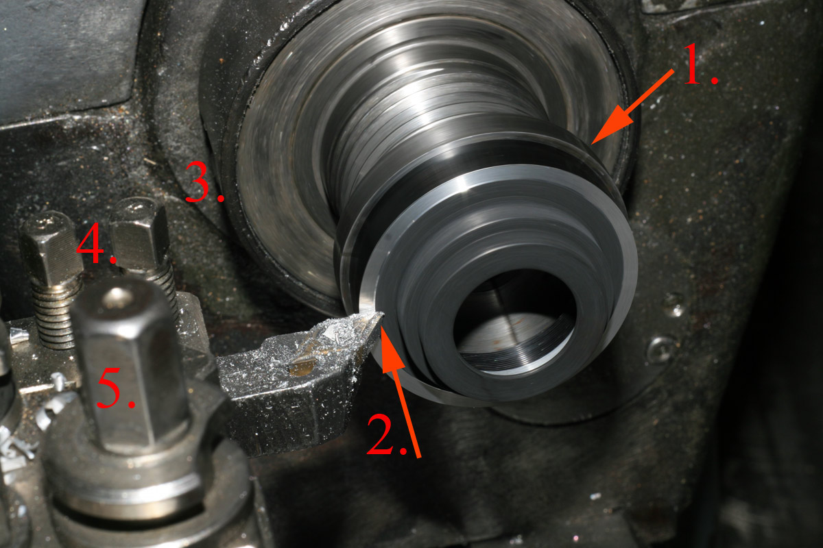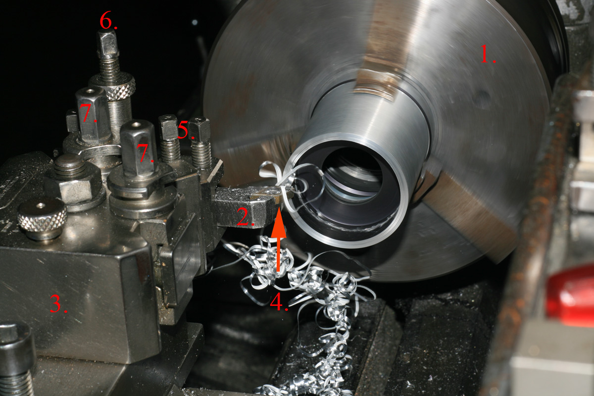 1. Abstechwerkzeug (kleine dünne Platte mit geschliffener Schneide, die an der gewünschten Stelle in das Aluminium eindringt und eine Furche schneidet, bis sich der zu kürzende Teil vom Hauptkörper löst...